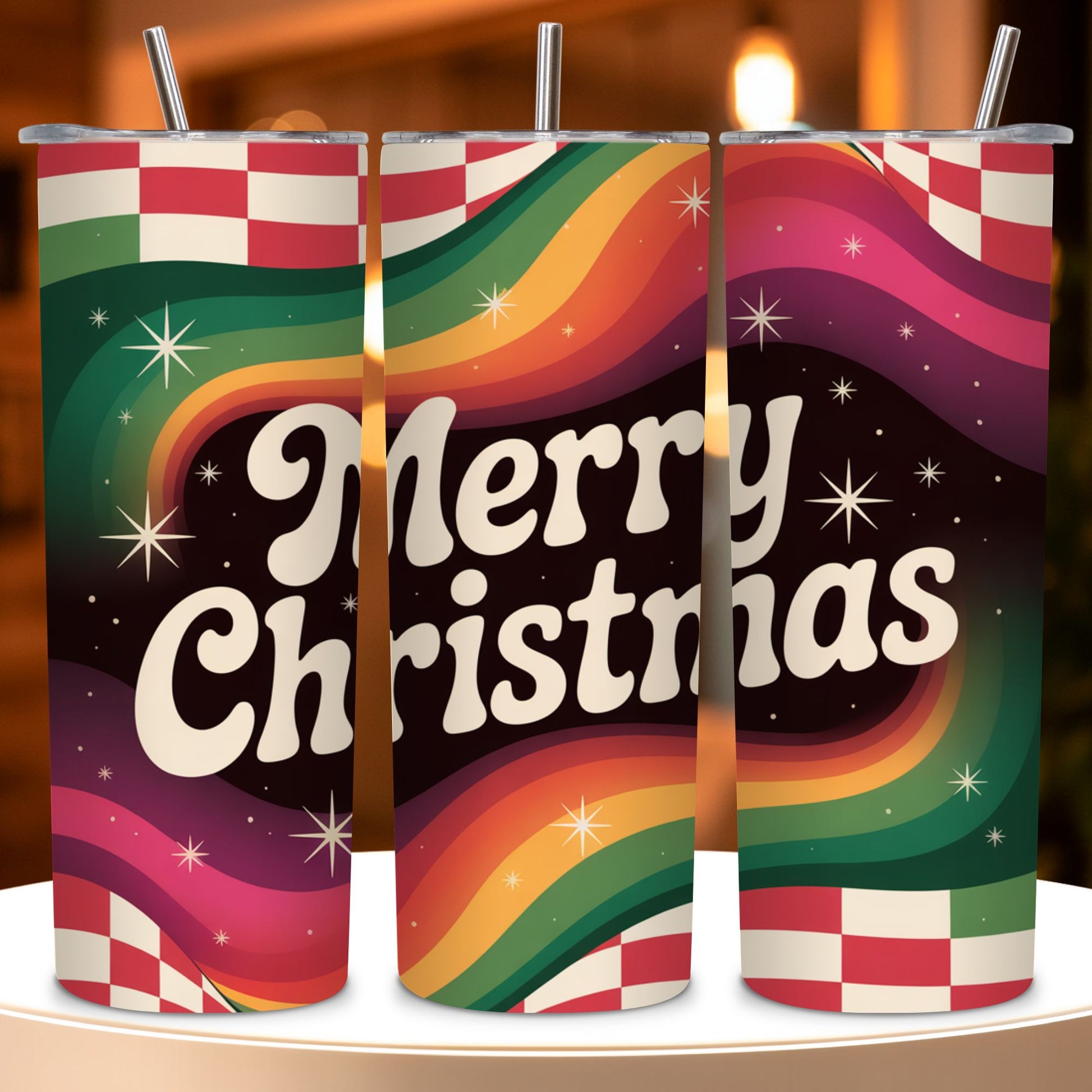 Featuring rainbow waves, checkerboard accents, and groovy “Merry Christmas” lettering.