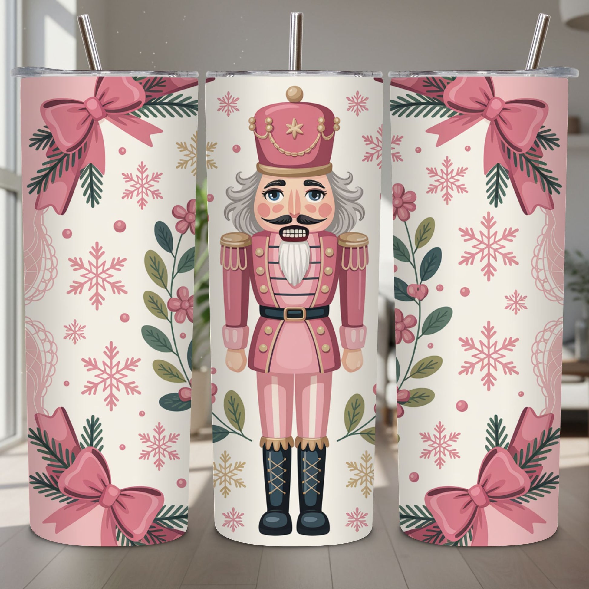 Celebrate the season with vintage charm! This elegant tumbler wrap features a pink nutcracker surrounded by festive florals, bows, and snowflakes